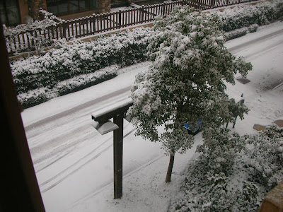 - It began to snow Thursday evening. Friday morning, I awoke, looked out the window, and saw the snow had stayed. It is a thin sprinkling, like icing sugar dabbed on chocolate cake.